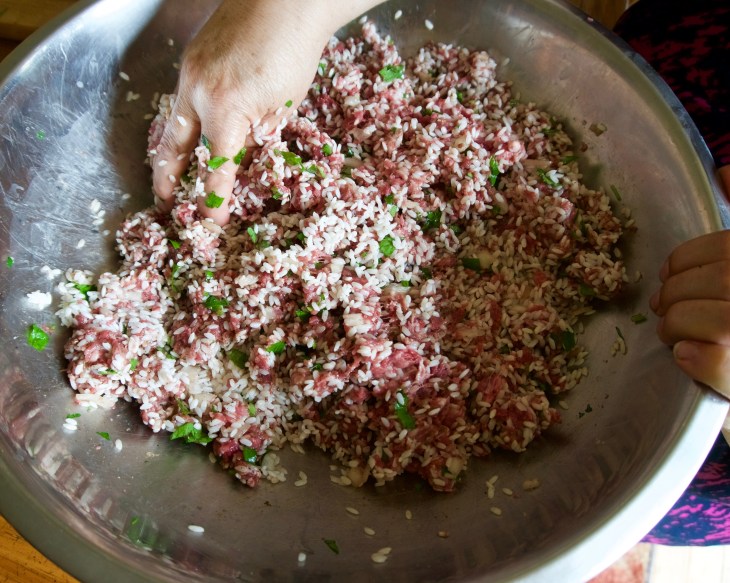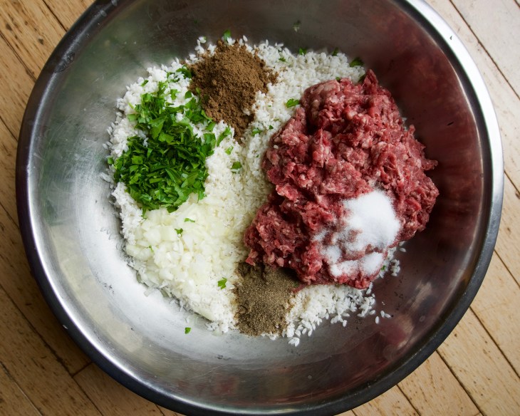 To prepare the filling: Strain the soaking water from the rice. In a large bowl, combine the rice, beef, onion, parsley, olive oil, and seasonings. Using your hand, work the filling to ensure all the ingredients are incorporated. Taste the filling and adjust the seasoning to your liking.