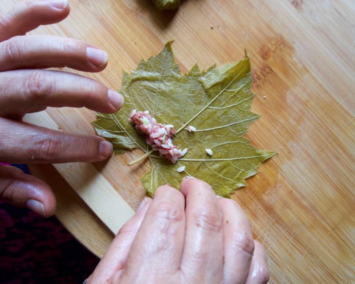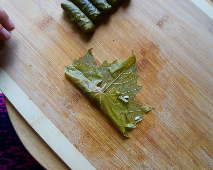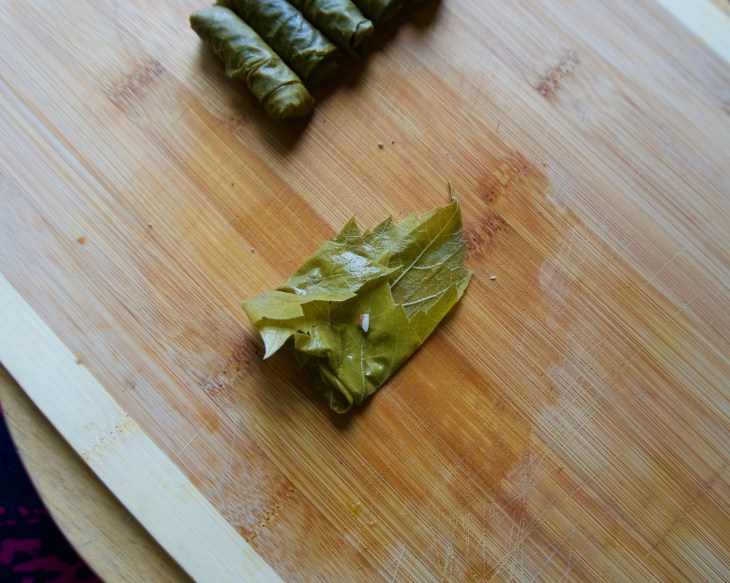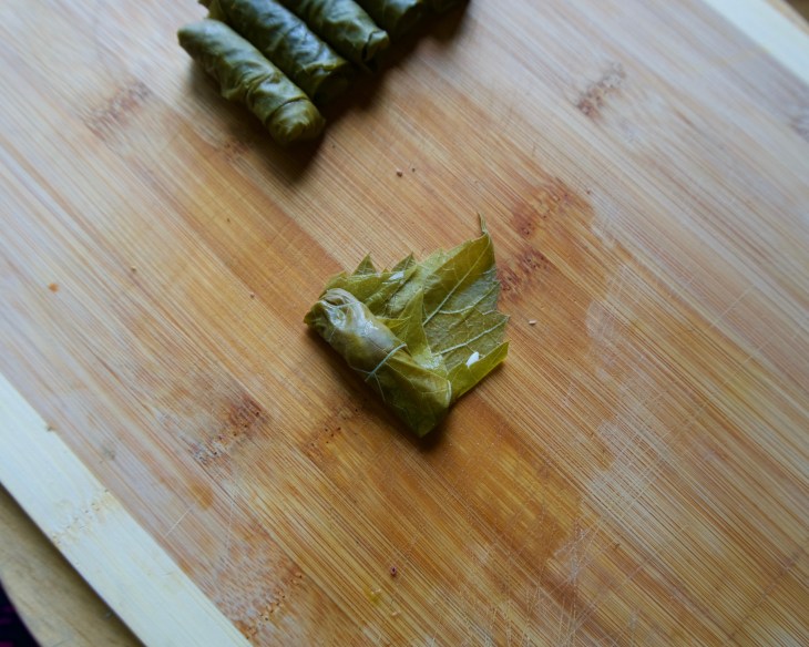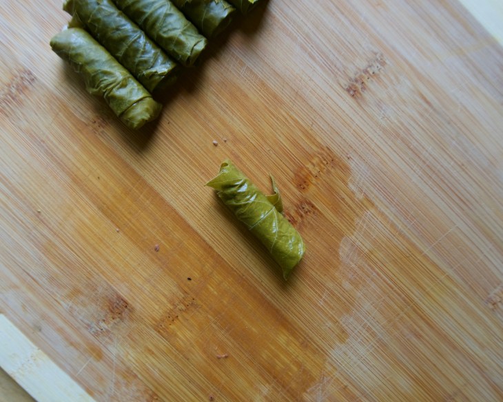 Rolling the grape leaves: On a cutting board or flat plate, lay the grape leaf smooth side down. Depending on the size of the grape leaf, place anywhere from 2-3 teaspoons of filling at the bottom of the leaf, spreading it horizontally. Lift the bottom of the leaf over the filling. Then fold each side over the center. While keeping all those sides tucked over the filling, continue to roll the grape leaf from the bottom to the pointy top of the leaf until you have a complete roll. You want it to be slightly tight, but remember the filling needs some room to expand during the cooking process-so, not too tight and not too loose. It takes some practice, but the process is very similar to rolling spring rolls or eggrolls.