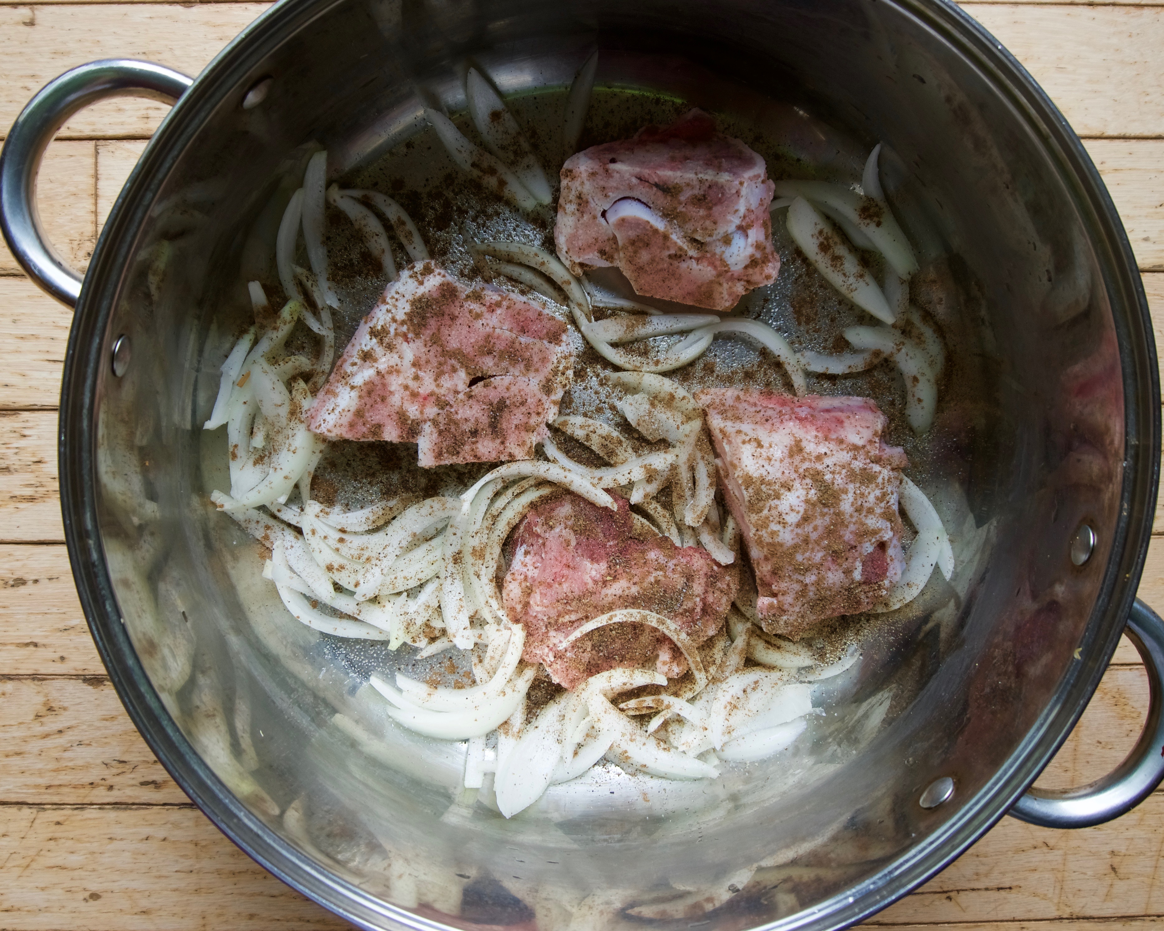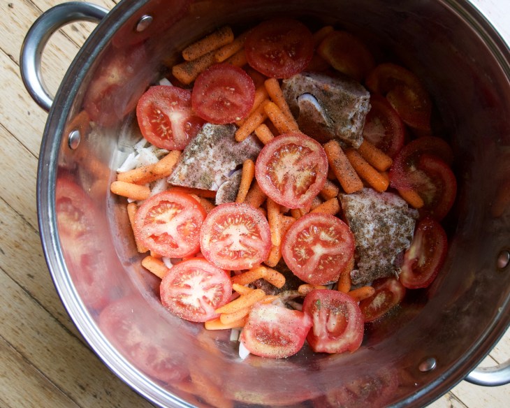 To prepare the pot: In a large pot, layer the beef bones, onions, tomatoes and carrots. Adjust them to make it as even of a surface as possible for the grape leaves to be stacked on. Drizzle with olive oil and season with salt and black pepper.