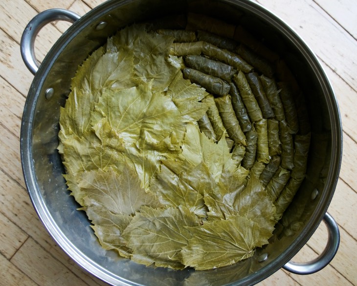 Stack the stuffed grape leaves in the prepared pot seam side down. Tuck them close together either in rows or around the pot in a circle pattern. Arrange them neatly and continue to stack them in layers. When complete, lay a thin layer of grape leaves on top to seal everything in. This is a great way to use leaves that were torn or too small/large and couldn’t be rolled.