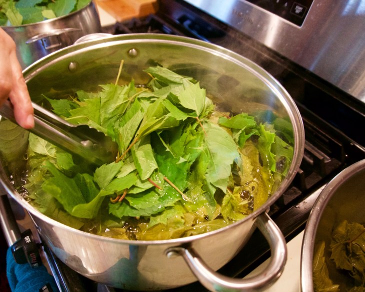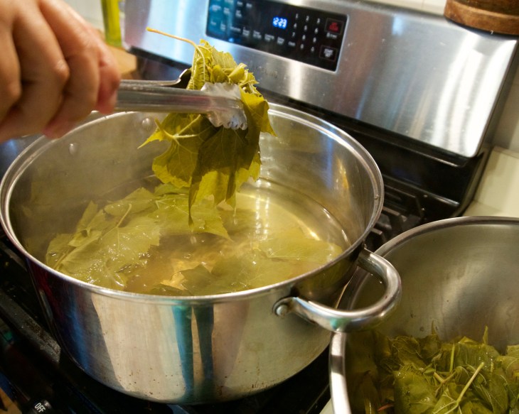 To cook: Sprinkle 3-4 tablespoons of salt over the rolled grape leaves. Pour hot water gently over the grape leaves, helping the salt dissolve and spread, until there is enough water to cover them all. Place a heavy plate or lid from a smaller pot on top of the grape leaves to weigh them down. Bring the pot to a boil. At this point, taste the liquid for salt and sourness-grape leaves have a natural sour flavor to them, but the strength varies. If necessary, adjust the salt to your liking and sourness by adding lemon juice or a sprinkle of citric acid. Reduce the temperature to low, cover the pot and allow the grape leaves to simmer for 1 1/2 hours.