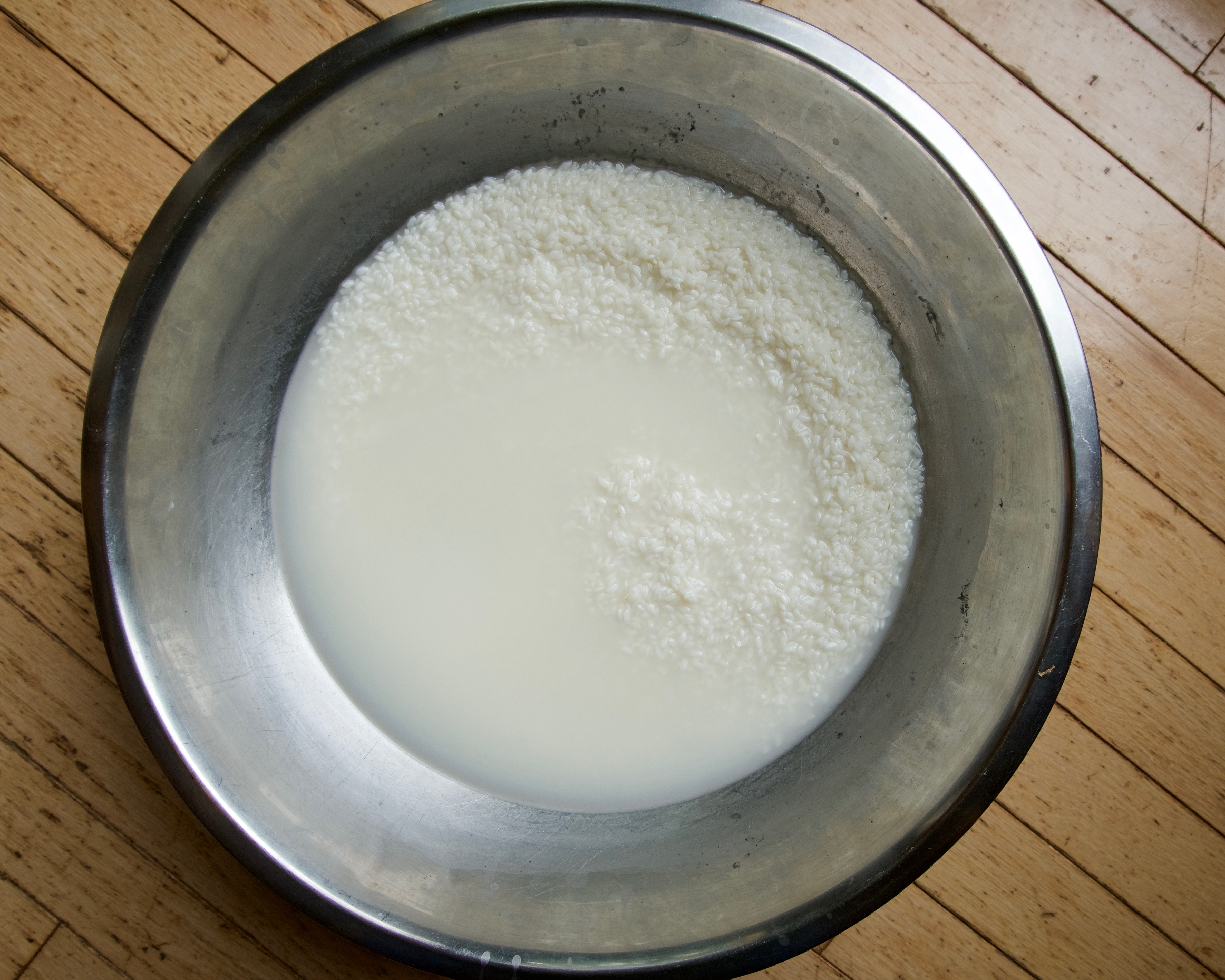 In a large bowl, soak the rice with enough water to completely cover it. Allow the rice to soak for 30-45 minutes while you prepare the grape leaves, filling, and pot.