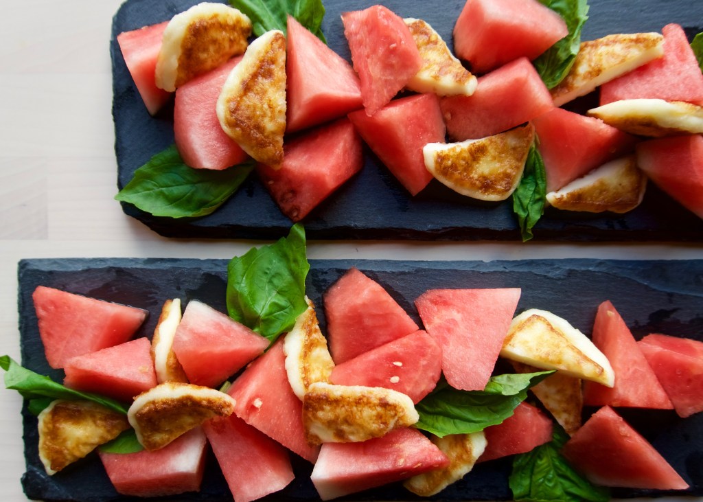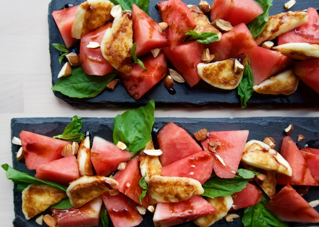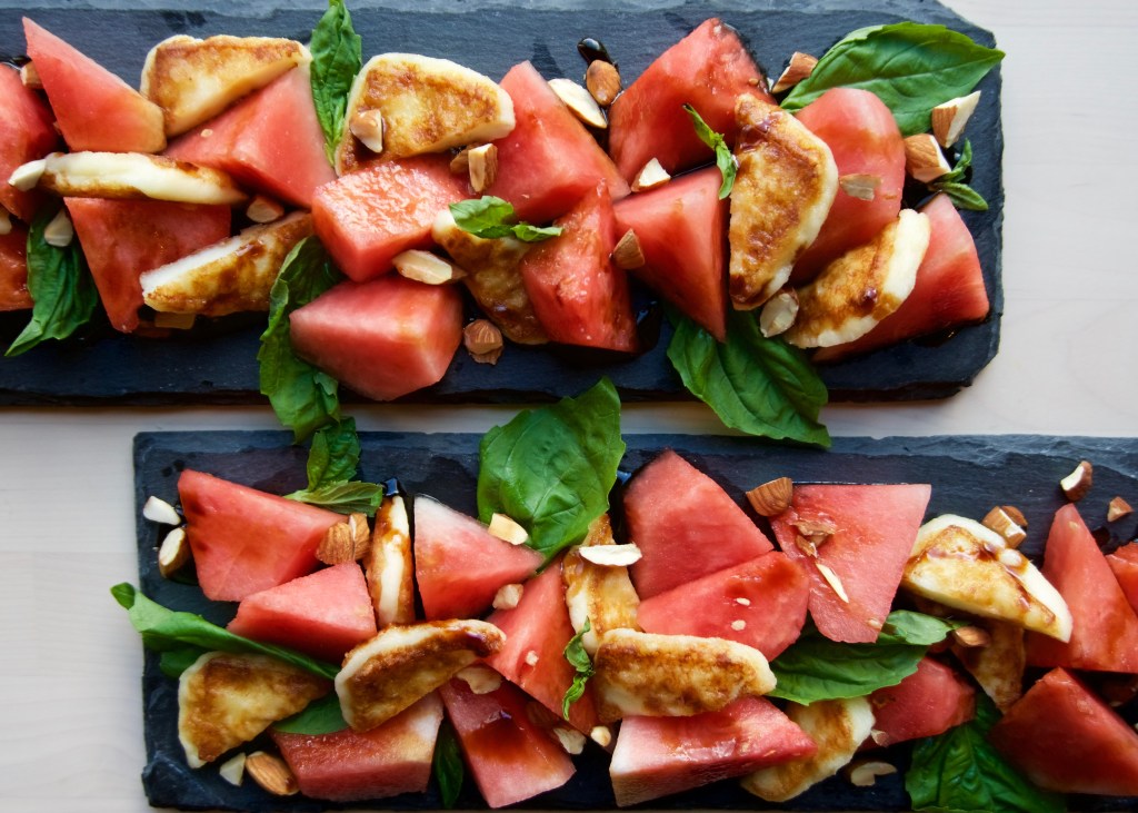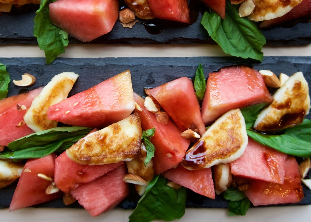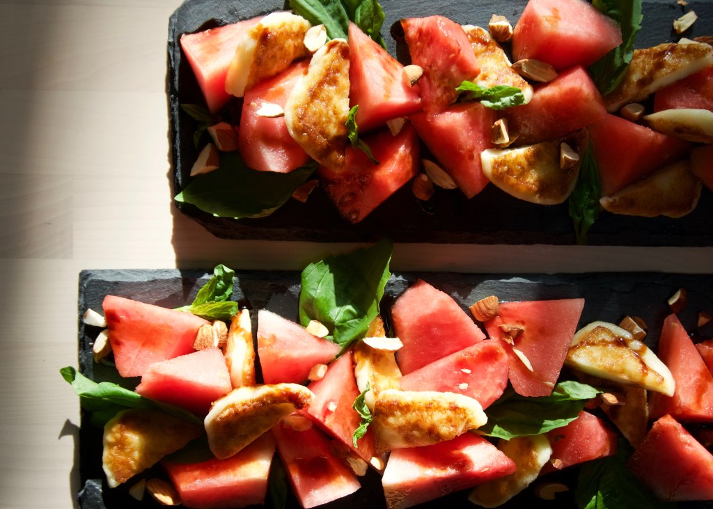 I took flavor inspiration from the well-loved combination of watermelon and cheese of my cultural background, those summer nights of fruit and salty snacks of my childhood, and presented it in the way I’ve enjoyed Caprese salad. Rather than keeping the cheese raw, I prepared it as my mother often did for Sunday brunch-shallow fried in olive oil, giving it a light crispy exterior and slightly melted interior that squeaks when you chew it. The addition of fresh basil, pomegranate molasses, and almonds add in extra layers of flavor and texture. As summer departs, this recipe honors the fruit and herbs of the season before we bid her adieu.