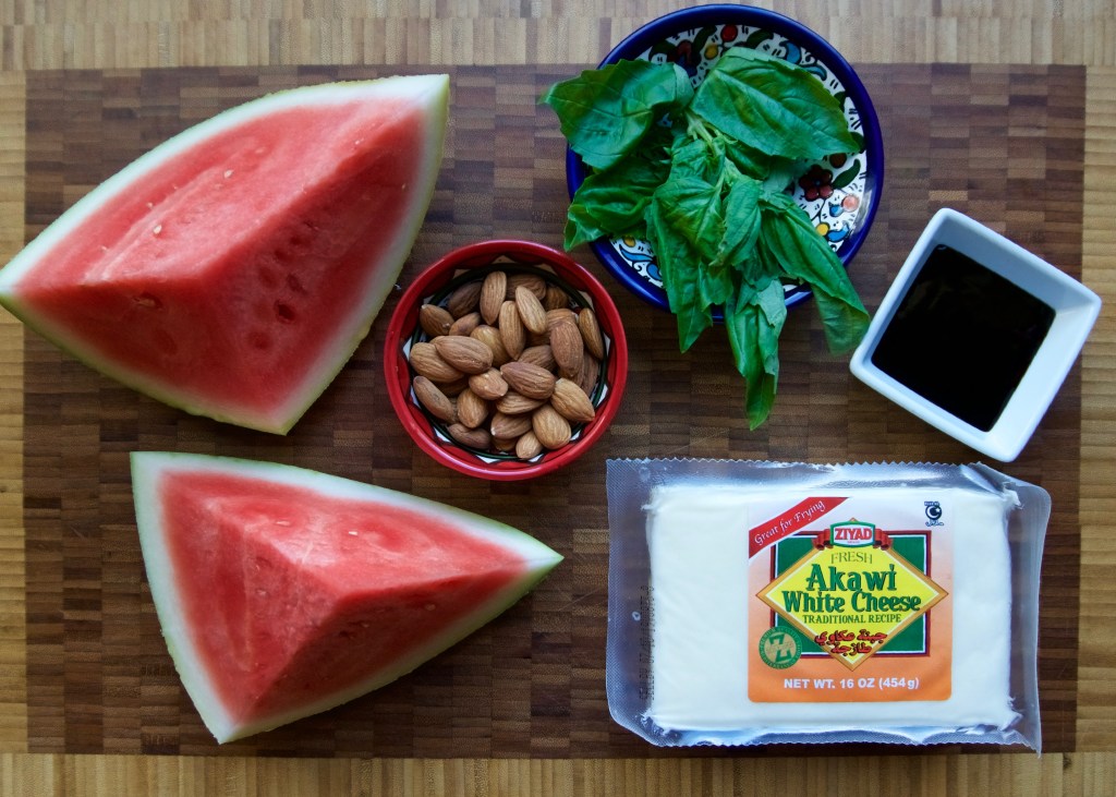 My memories of dining al fresco in the summer time didn’t involve mozzarella or basil. Many sticky Chicago summer nights were spent in a backyard, sitting on plastic stools or whatever could be converted into outdoor furniture. My mother and her friend (and neighbor) gently, yet confidently, prepared an entire platter of fruit using only their hands and small paring knives. The other kids and I hovered around and grabbed at the grapes as an appetizer, since they needed nothing more than a good wash. We slapped our ankles from the mosquito bites as we impatiently waited for stone fruit, oranges and melons to be ready to consume. A pot of mint tea or coffee would be waiting, steaming, until our mothers fed us so they could chat over a warm beverage and bizr*. Some nights the small backyard spread was upgraded with mixed nuts, dessert or the addition of cheese, often eaten alongside watermelon. It was sometimes a homemade, brined white cheese or salty feta bought from a local dukkan**. A savory, salty flavor to offset the sweetness of summer melon. I’ll admit, it wasn’t a pairing I appreciated until later in my life.