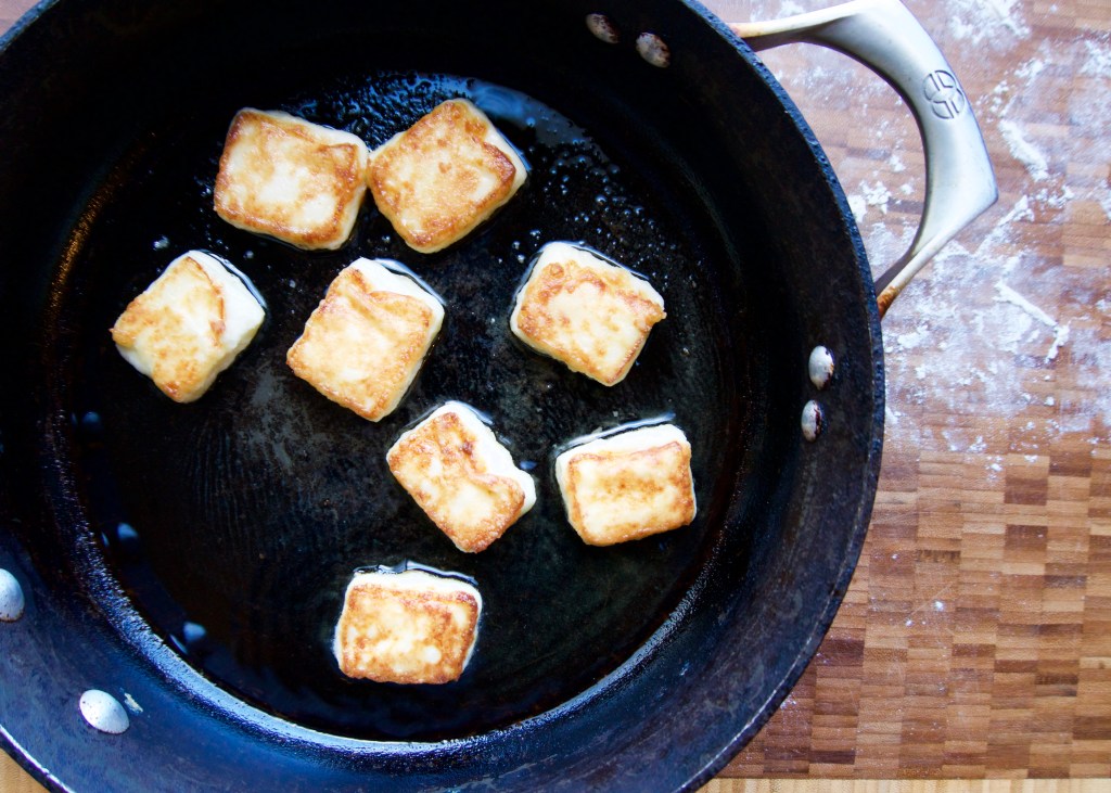 In a small, nonstick pan, warm a few tablespoons of olive oil on medium heat. While the oil warms up, lightly coat the pieces cheese in cornstarch and dust off any access. Gently place the cheese into the oil and allow it to fry until it forms a golden brown crust. This will take about 30 seconds to a minute. Flip the cheese and allow the other side to brown. When complete, place the cheese on a paper towel to absorb any excess oil.